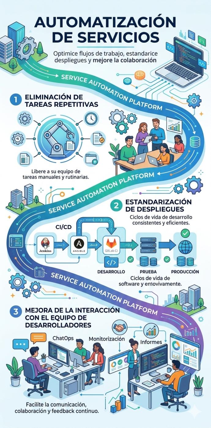 Elimine las tareas repetitivas, estandarice los despliegues con herramientas de automatización y mejore la interacción con el equipo de desarrolladores de su organización.